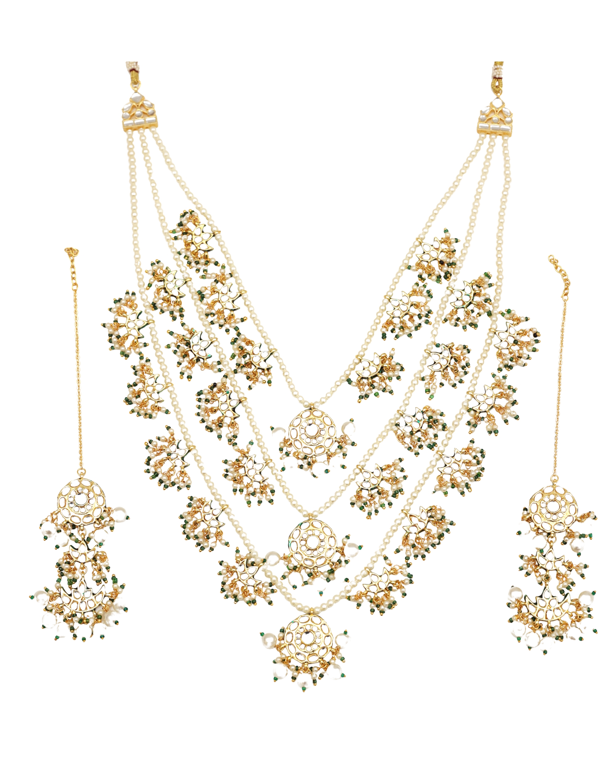 White Gold-Plated Kundan Pearl Necklace Set with Maang Tikka and Jhumki Earrings