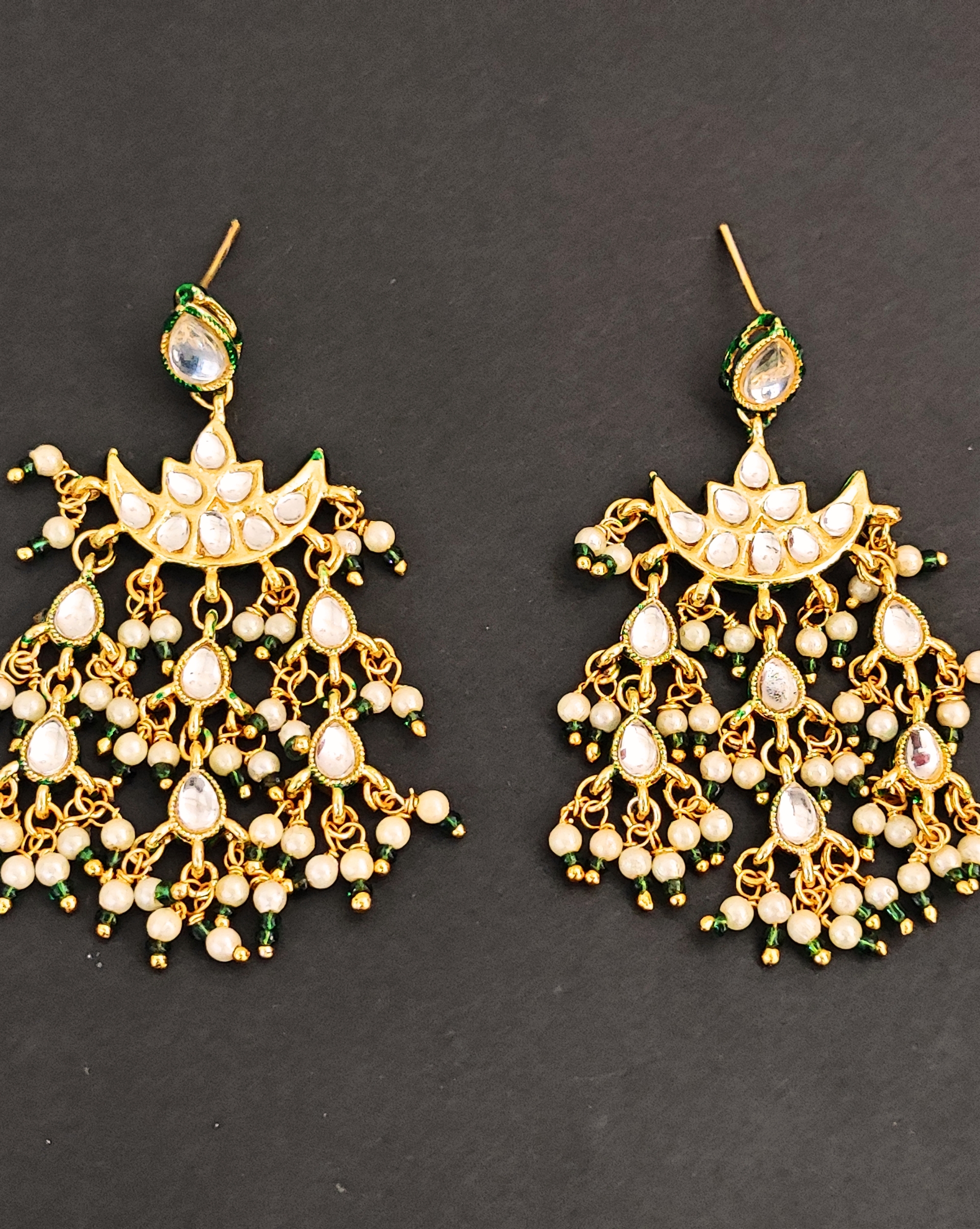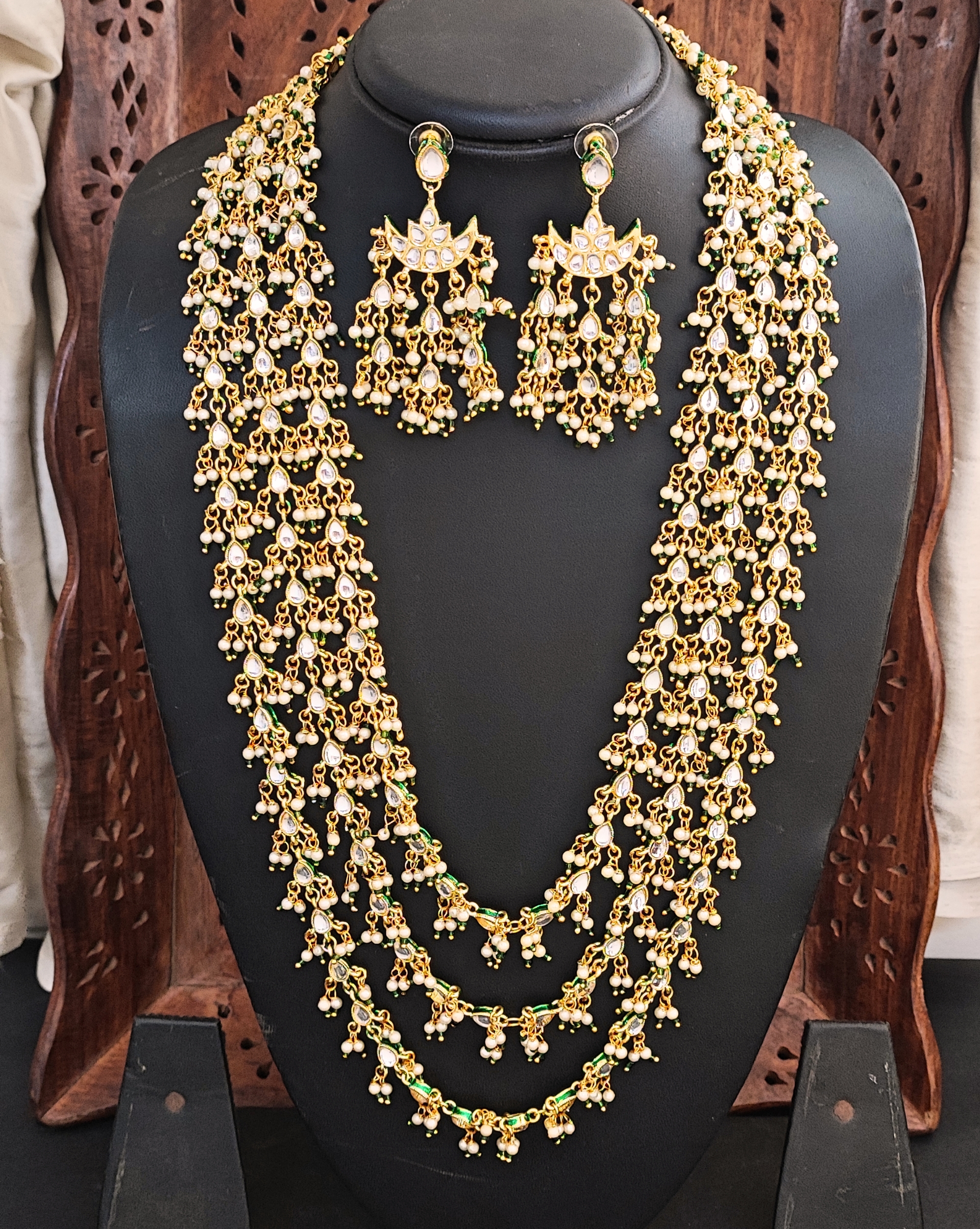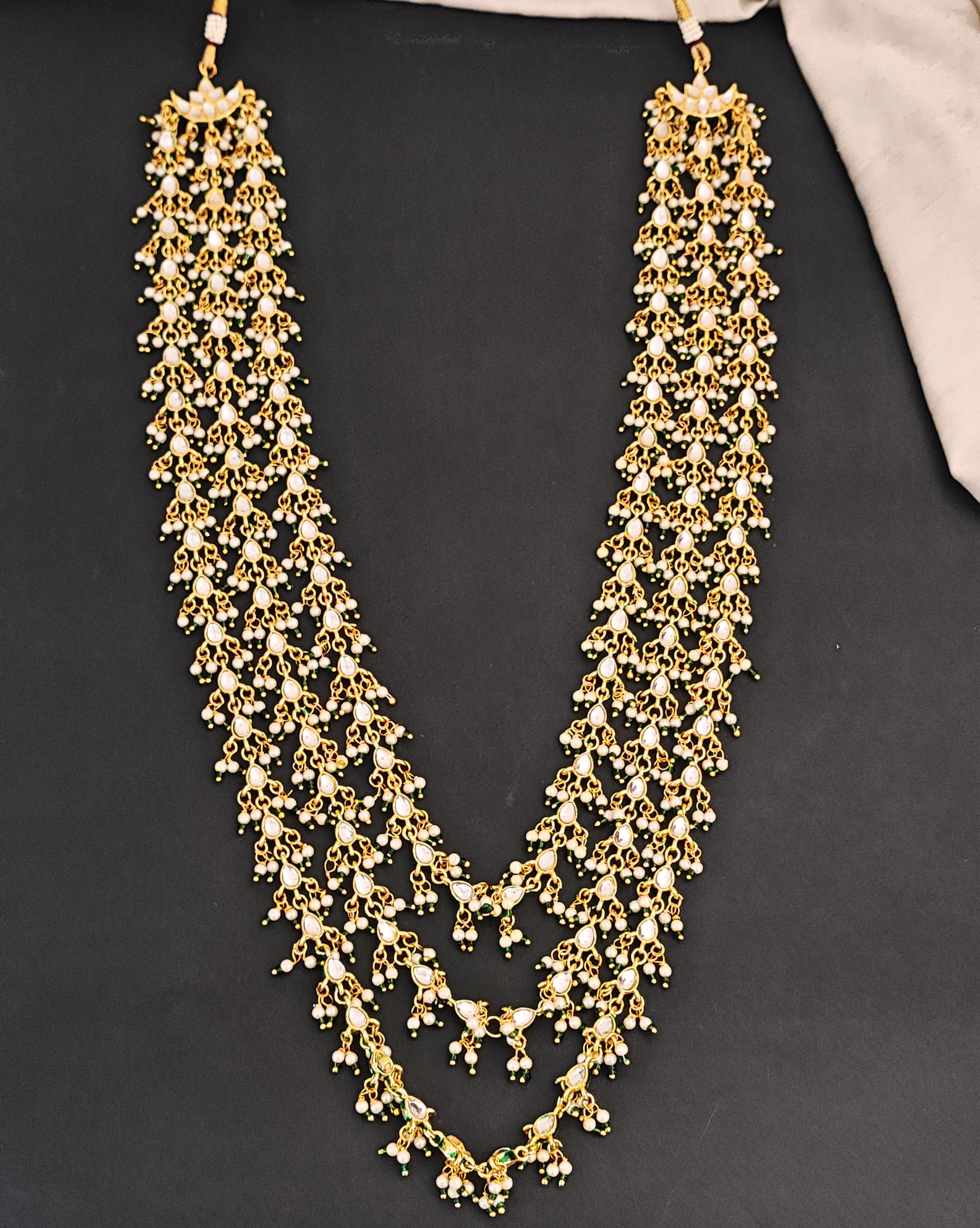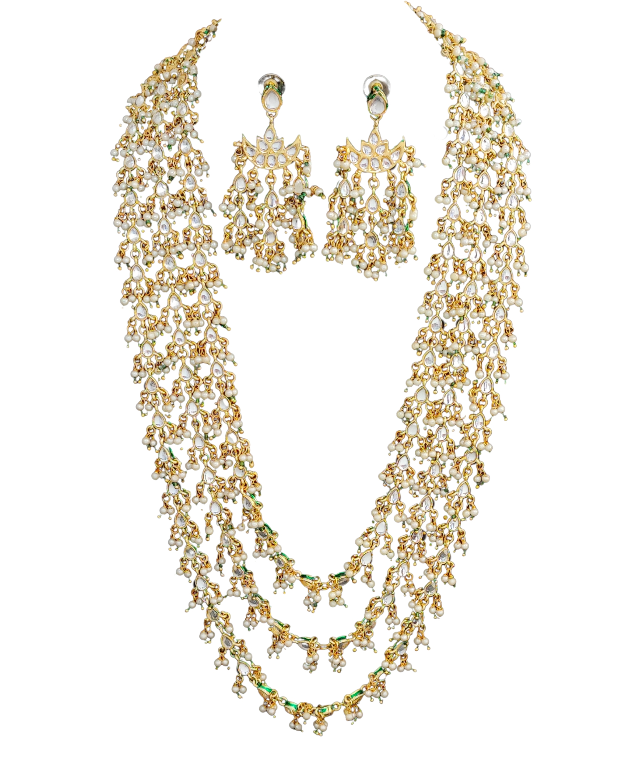 Traditional Kundan Pearl Necklace Set with Earrings, High Gold-Plated, Multi-Layered Design, Green and White Beads & Pearls