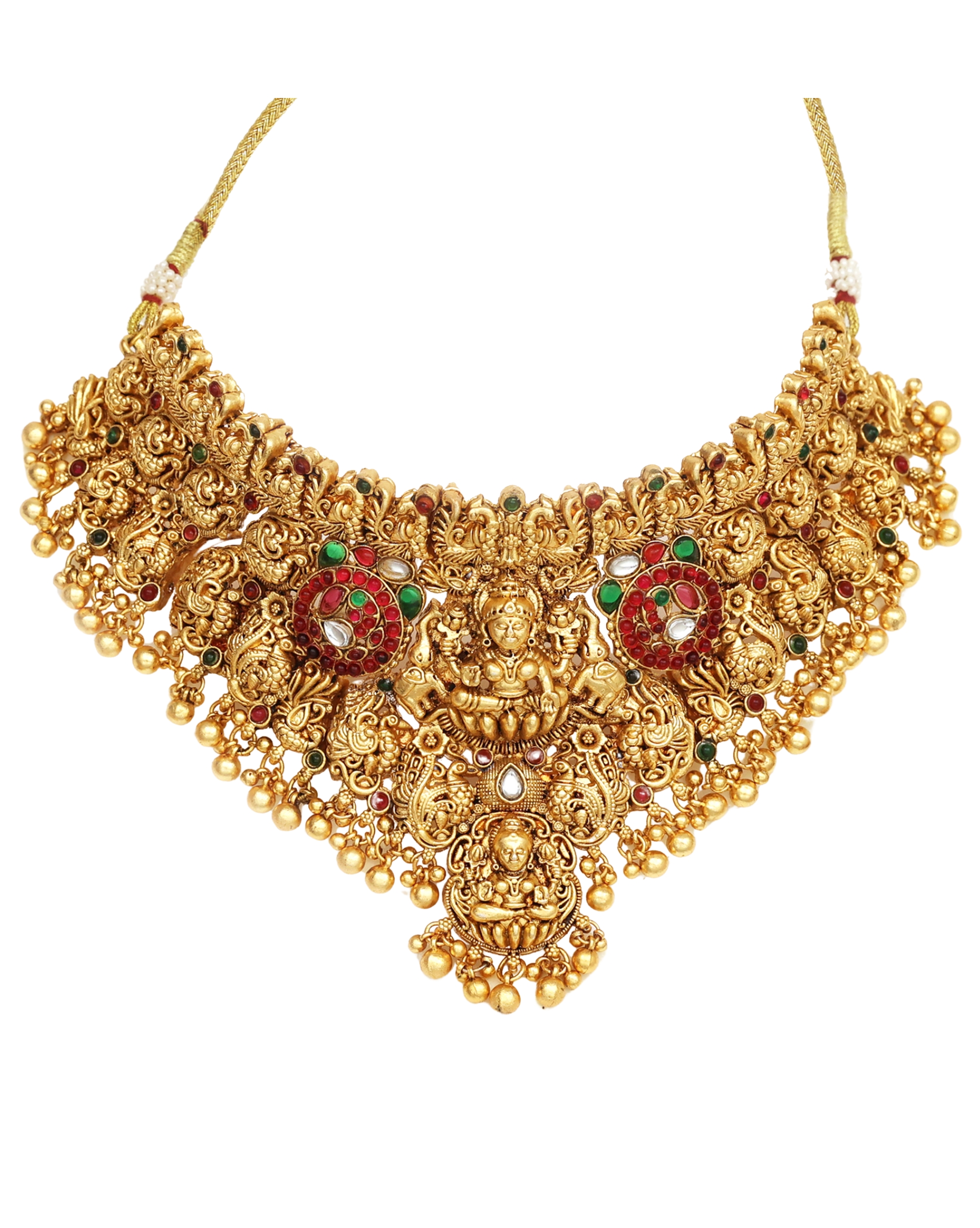 Traditional Lakshmi Ideal Pendant Design Gold-Plated with Red & Green Stone Necklace Set for Women