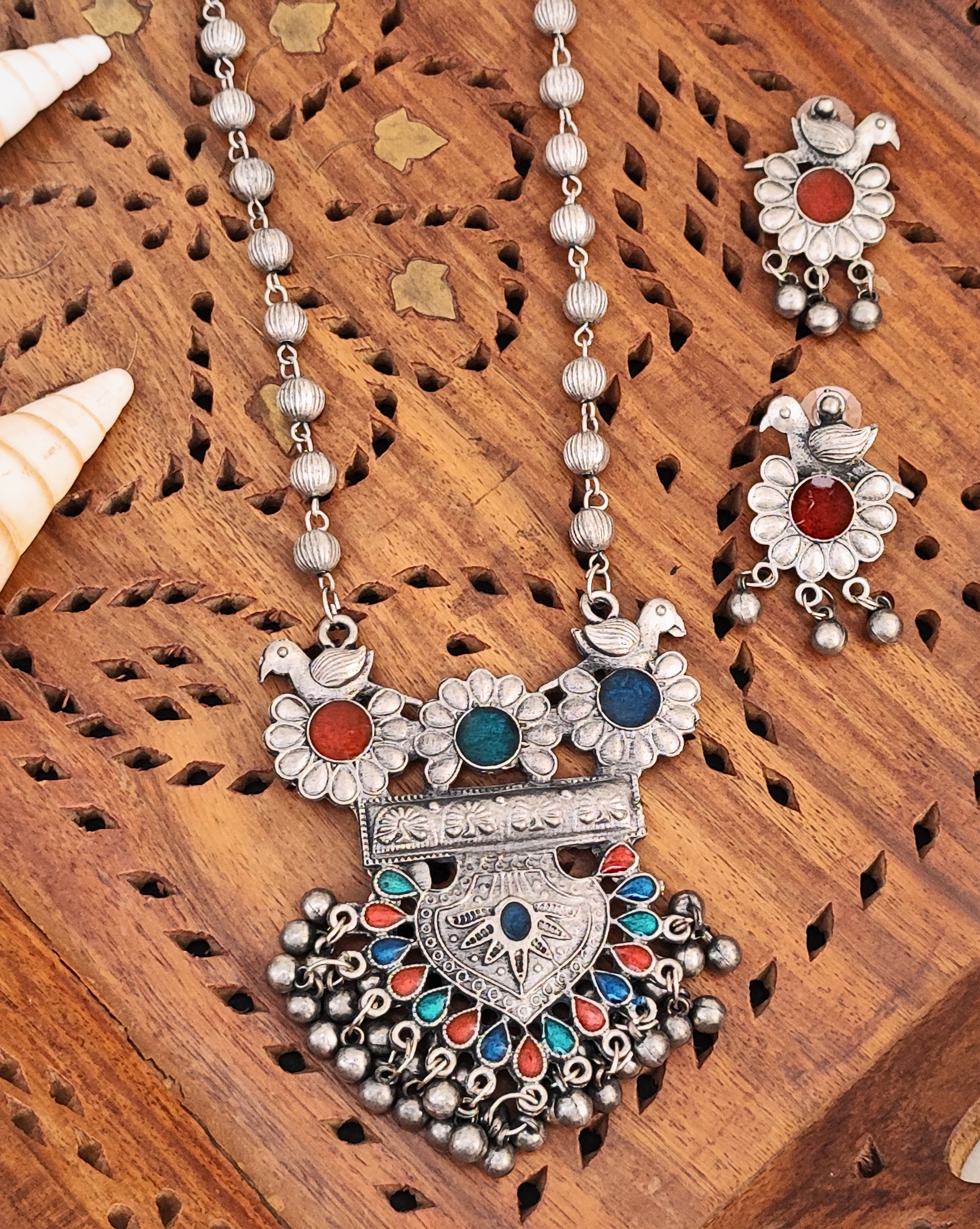 Traditional Oxidised Silver Necklace Set, Multicolour Enamel Pendant, Beaded Chain, Matching Earrings