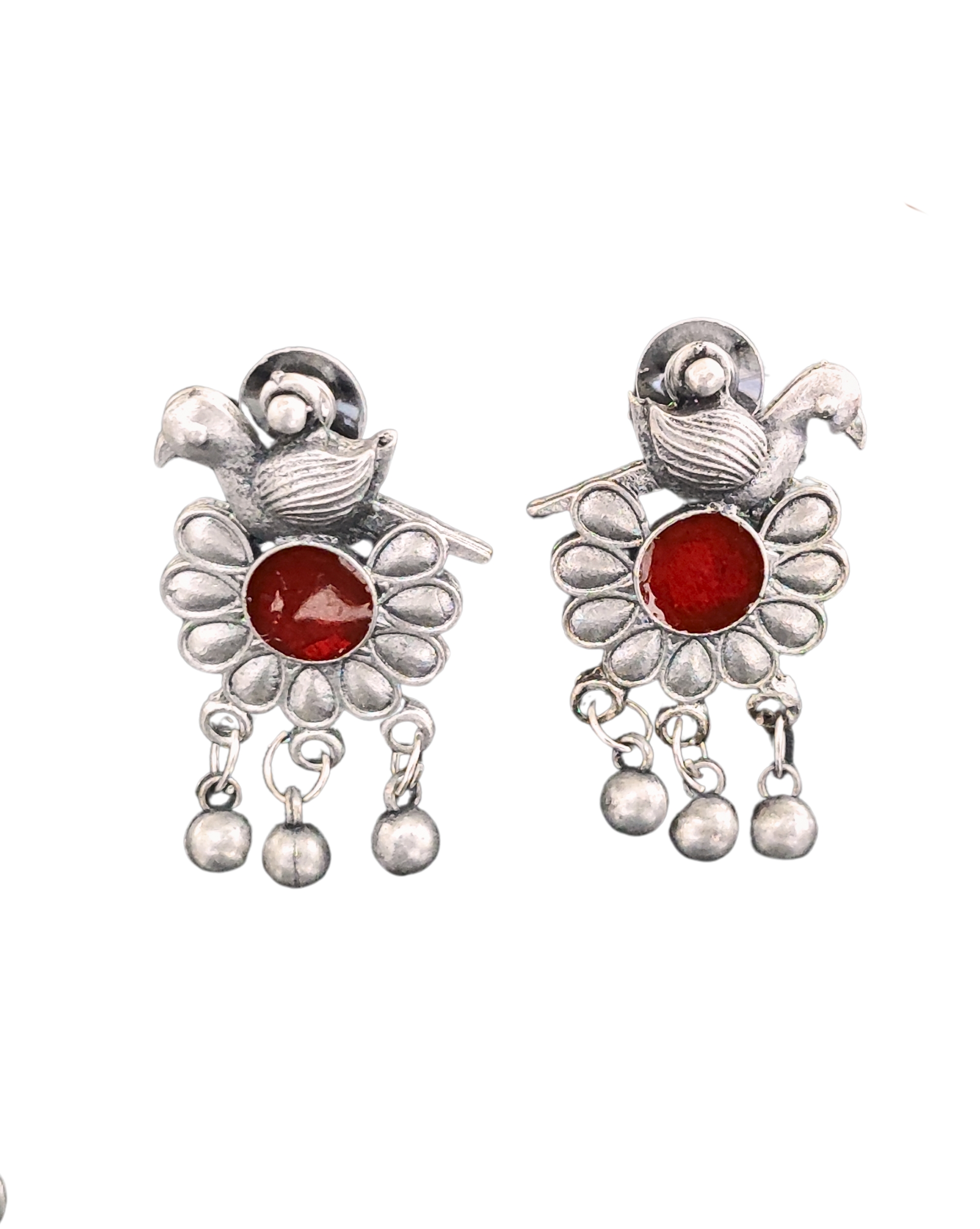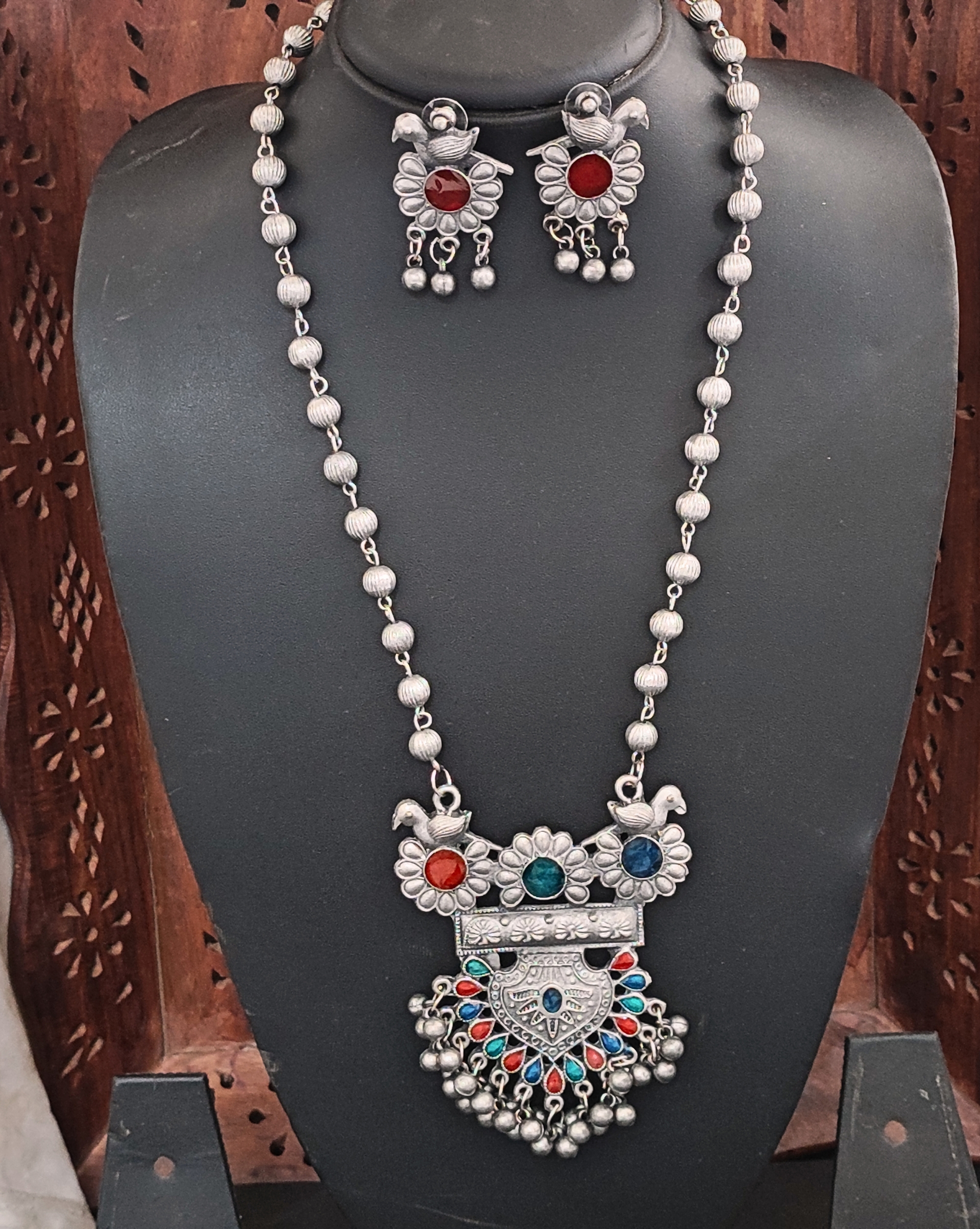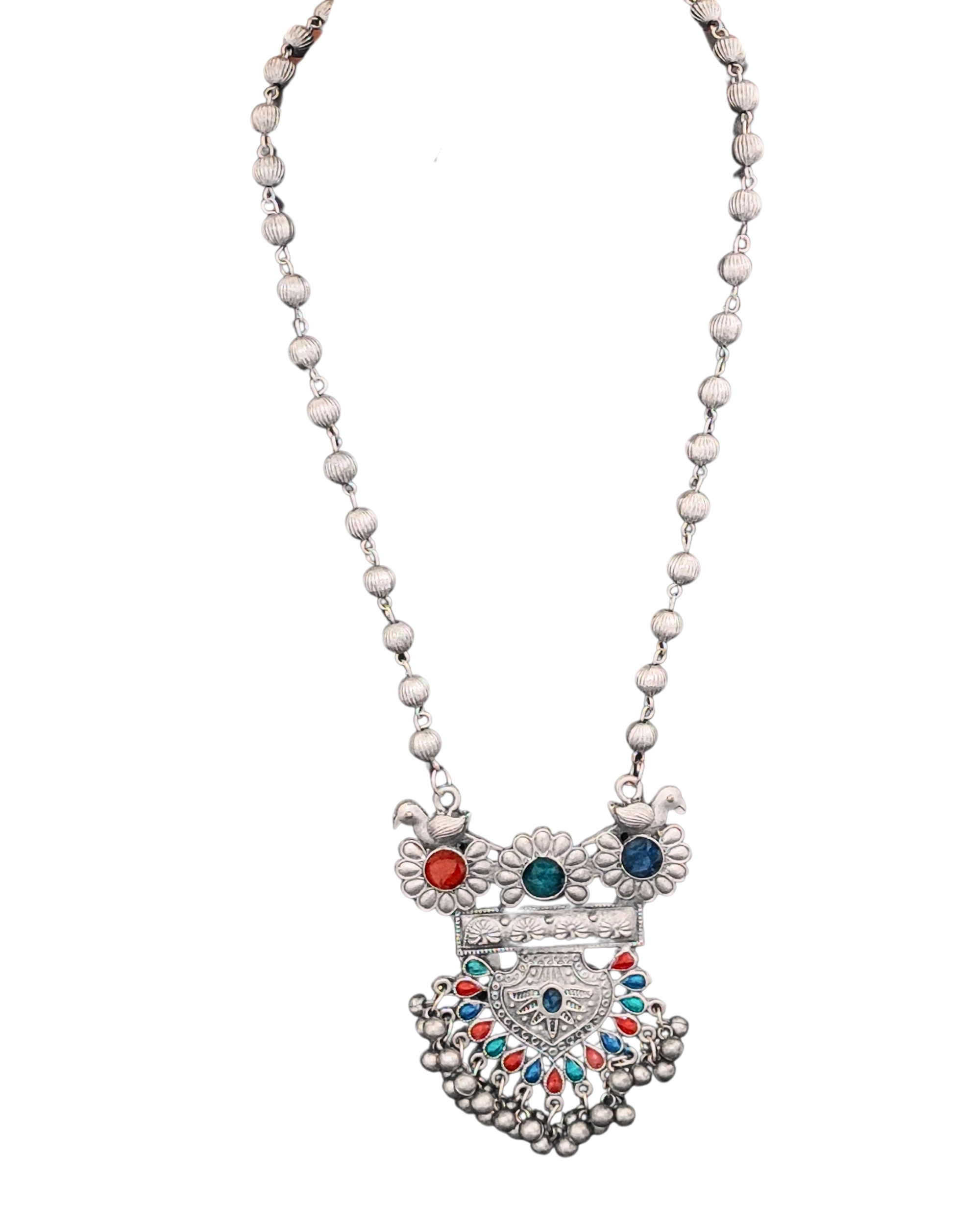 Step into the world of timeless elegance with this breathtaking oxidised silver tribal necklace set, a tribute to traditional Indian artistry. The striking centrepiece features an intricately detailed pendant, adorned with vibrant enamel work in coral red, deep blue, and turquoise, all set against a classic antique silver base. Delicate bird motifs and floral patterns enhance its vintage charm, creating a truly captivating focal point. The 45-centimetre beaded chain is thoughtfully designed with evenly spaced silver spherical beads, adding subtle sophistication. Complementary drop earrings echo the necklace’s design with matching bird and flower motifs, finished with graceful dangling bells that sway with movement. Crafted using traditional techniques like bezel-style enamel placement and fine filigree metalwork, the set showcases exceptional workmanship. Perfectly suited for both traditional Indian wear and contemporary fusion styles, it’s ideal for festive occasions and cultural events. The oxidised finish lends a unique aged allure, while the sturdy brass base ensures long-lasting durability. At 5 centimetres, the earrings provide the perfect complement to the statement necklace.