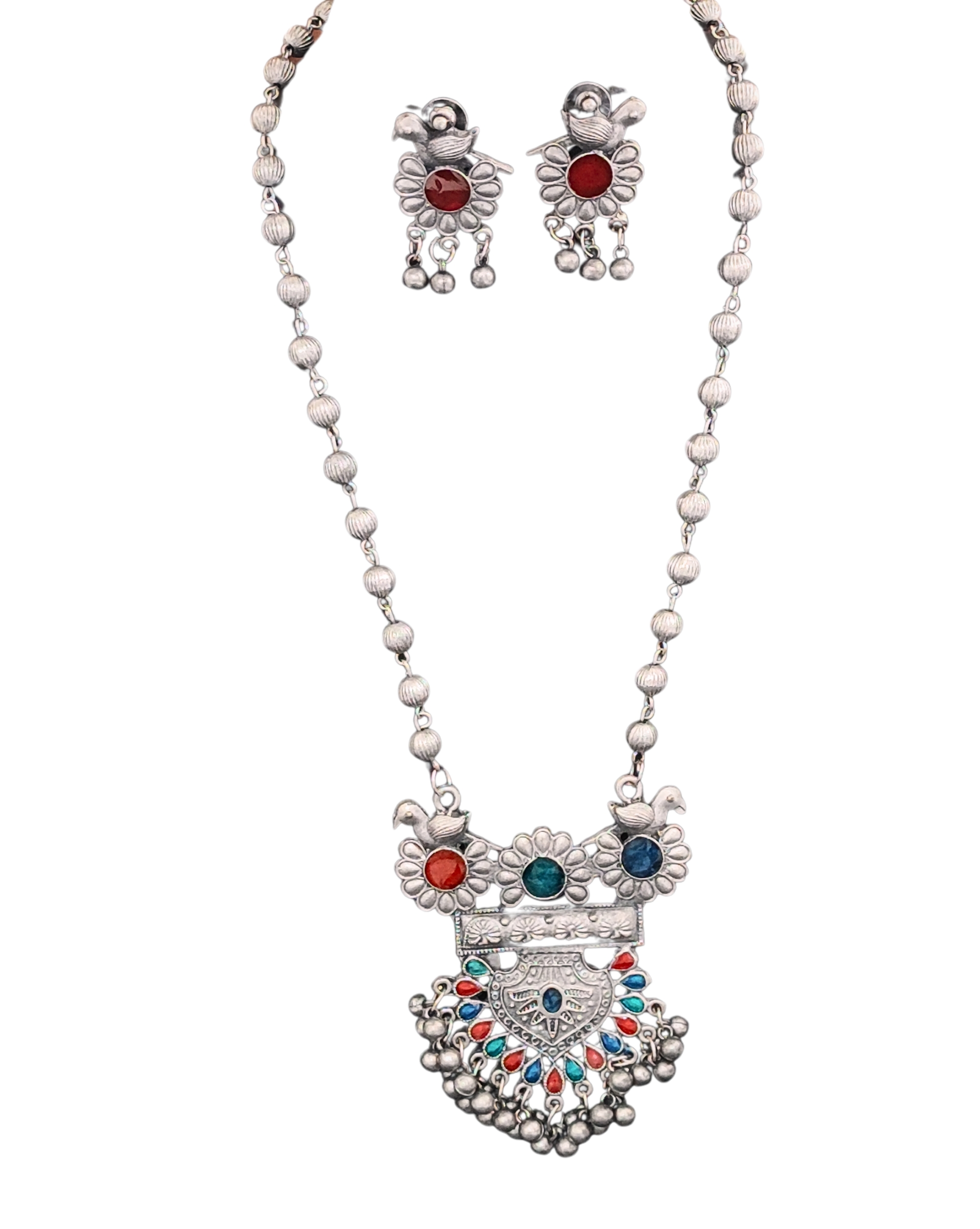 Traditional Oxidised Silver Necklace Set, Multicolour Enamel Pendant, Beaded Chain, Matching Earrings Original price was: ₹3,429.00.Current price is: ₹860.00.