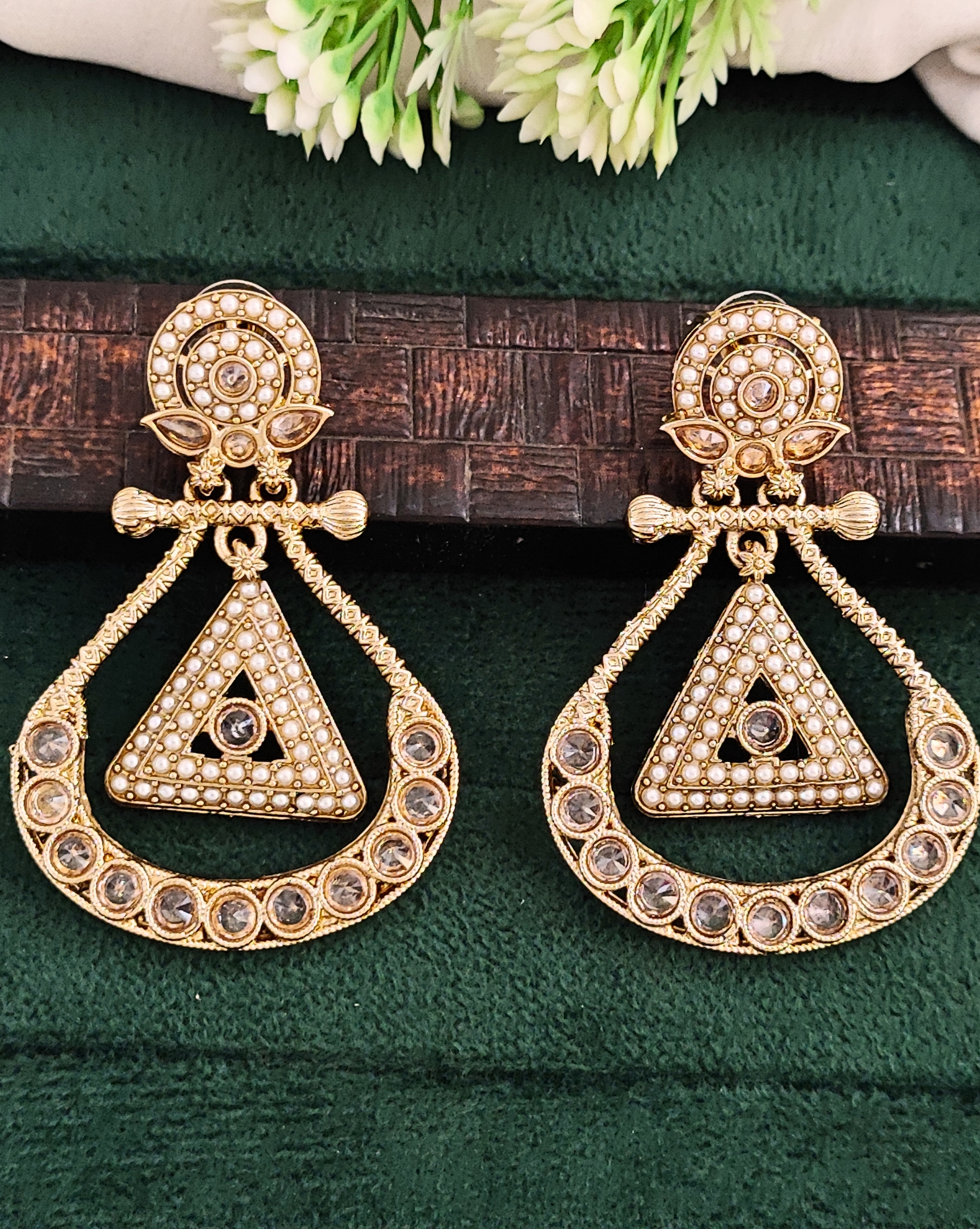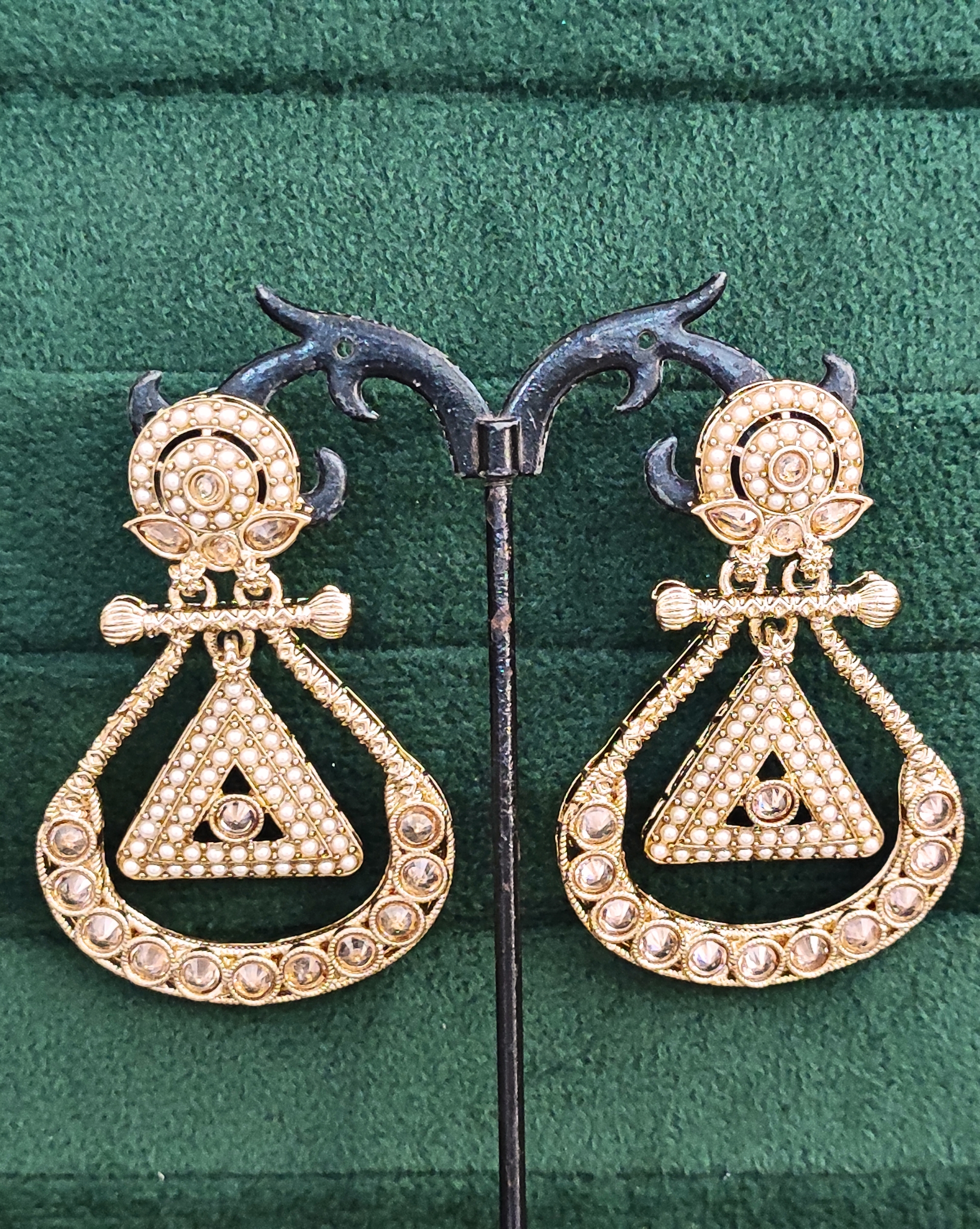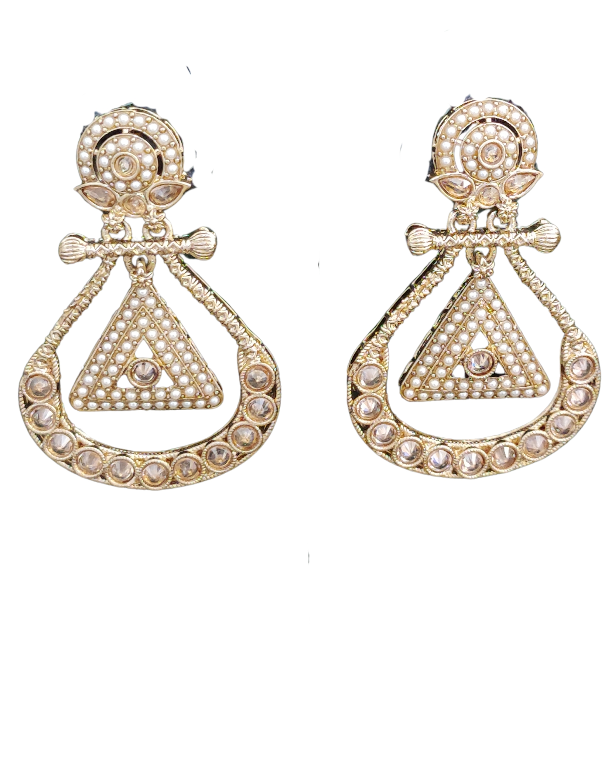 Make a stunning style statement with these exquisite chandelier earrings that beautifully blend vintage charm with contemporary elegance. The intricate gold-toned design features a mesmerising combination of delicate pearls and sparkling crystals arranged in a sophisticated geometric pattern. The distinctive triangle motif at the centre is adorned with precisely placed pearls, while the curved lower section showcases brilliant crystal stones in individual settings. The top portion boasts a circular design embellished with pearls, creating a perfect balance of traditional and modern aesthetics. These drop dangle earrings are masterfully crafted with attention to detail, from the decorative bow-like element to the textured metalwork. Perfect for special occasions, festivals, or traditional ceremonies, these earrings will add a touch of grandeur to any ensemble. The substantial yet lightweight design ensures comfortable wear throughout your events. These versatile pieces complement both traditional Indian attire and contemporary western outfits with equal grace.