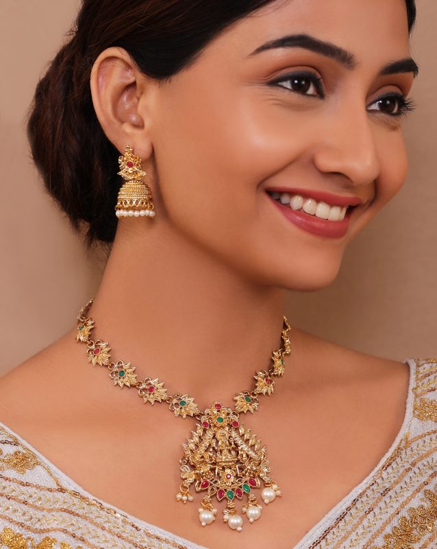 Antique Gold Temple Necklace Set with Laxmi Motif & Earrings – Bridal Jewellery for Women