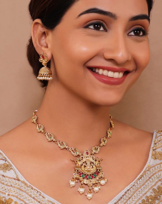 Laxmi Pendant Temple Jewellery Necklace & Jhumka Earrings Set