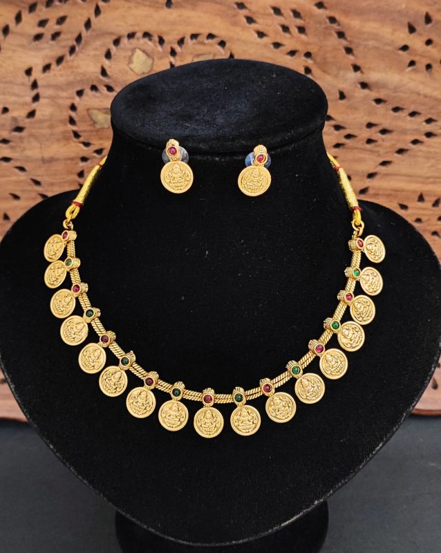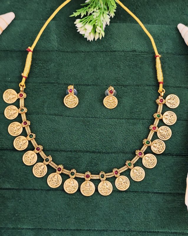 South Indian Jewelry Necklace Set with Lakshmi Pendant, Ruby & Green Stones, Coin Design, and Matching Jhumka Earrings for Occasional Wear