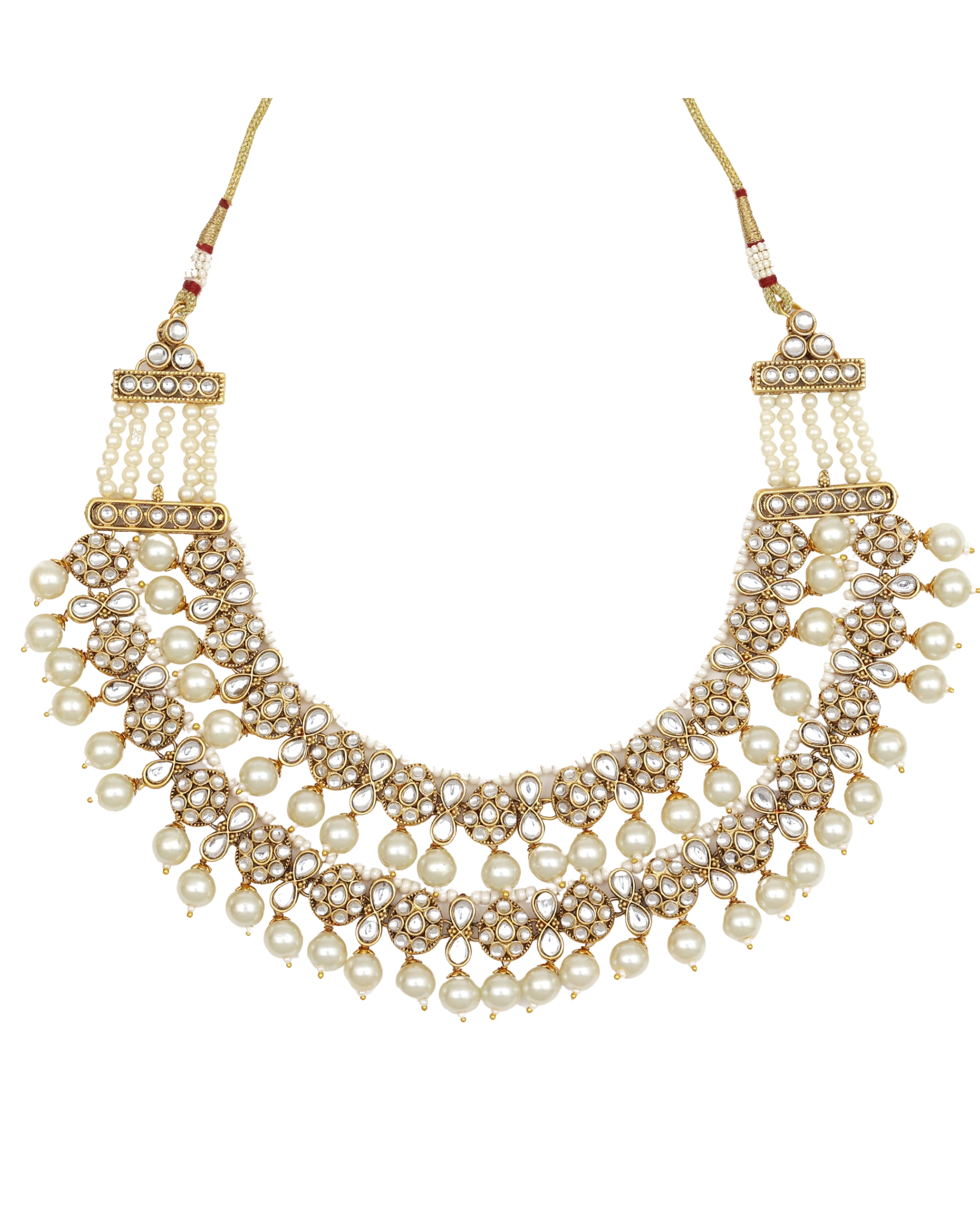 Elegant kundan-style necklace set featuring intricate floral patterns and butterfly motifs adorned with pearls and crystal-like stones. Perfect for wedding ceremonies, festivals, and special occasions, complementing both traditional and contemporary attire. Gold-toned metal base with detailed kundan work and multiple rows of pearl drops for luxurious appeal