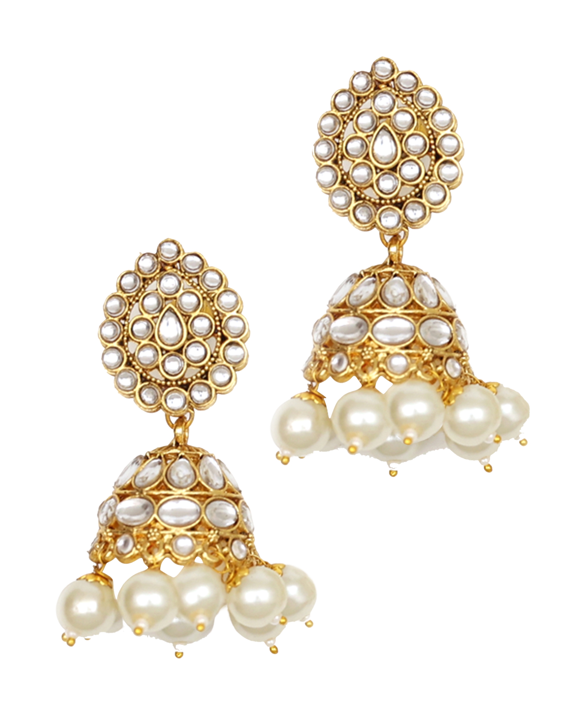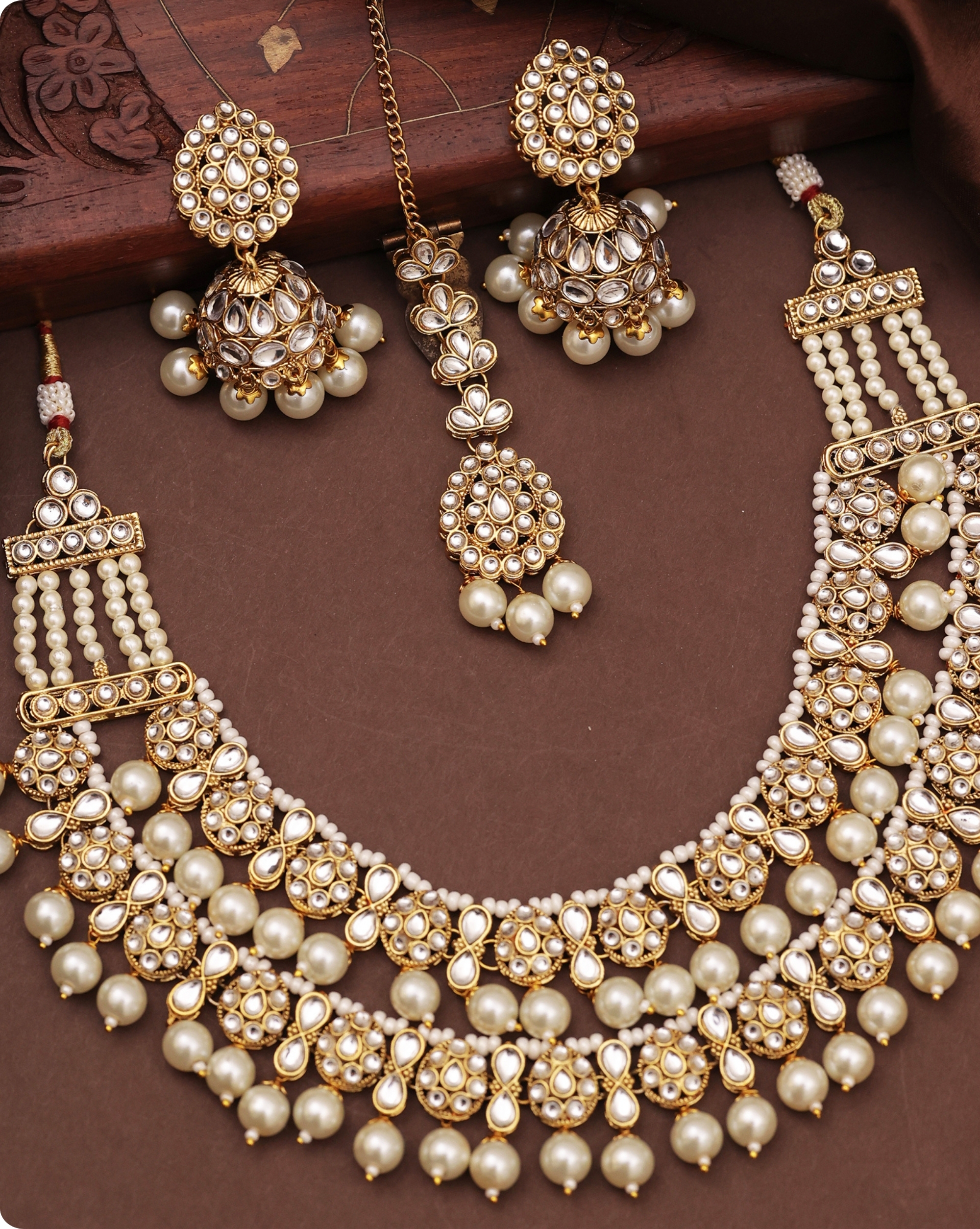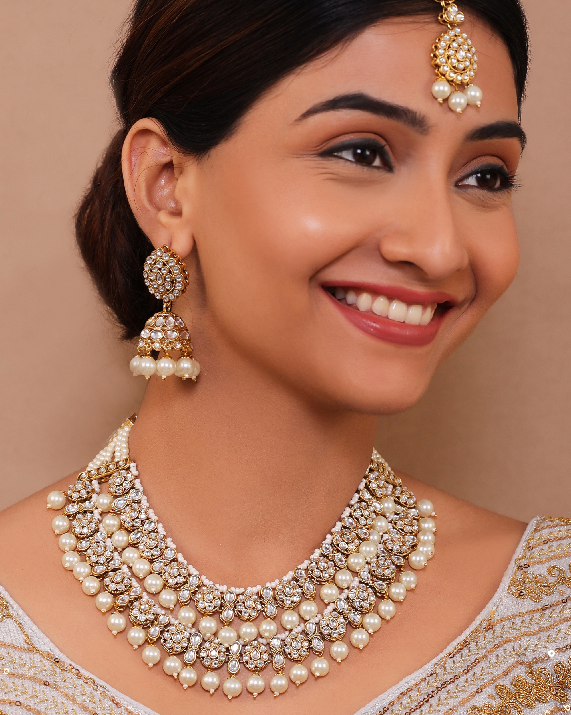 White Gold-Plated Kundan Pearl Necklace Set with Maang Tikka and Jhumki Earrings